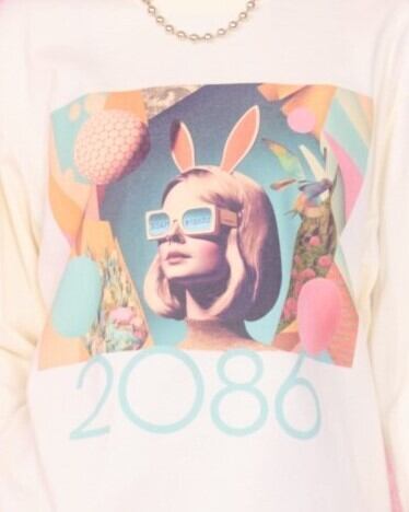 これまでには作っていないタイプの絵をモチーフに女の子がユートピアを想像してその空想の中に入り込んでいるイメージです。彼女はとても幸福そうに楽しそうにサングラス越しにその世界のことを考えています。このグラフィックの世界観からビジュアルもイメージを作り、他のアイテムもなんとなくパステル調にして今回のアイテムをまとめています。