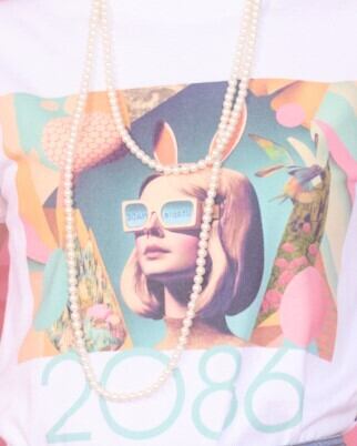 これまでには作っていないタイプの絵をモチーフに女の子がユートピアを想像してその空想の中に入り込んでいるイメージです。彼女はとても幸福そうに楽しそうにサングラス越しにその世界のことを考えています。このグラフィックの世界観からビジュアルもイメージを作り、他のアイテムもなんとなくパステル調にして今回のアイテムをまとめています。