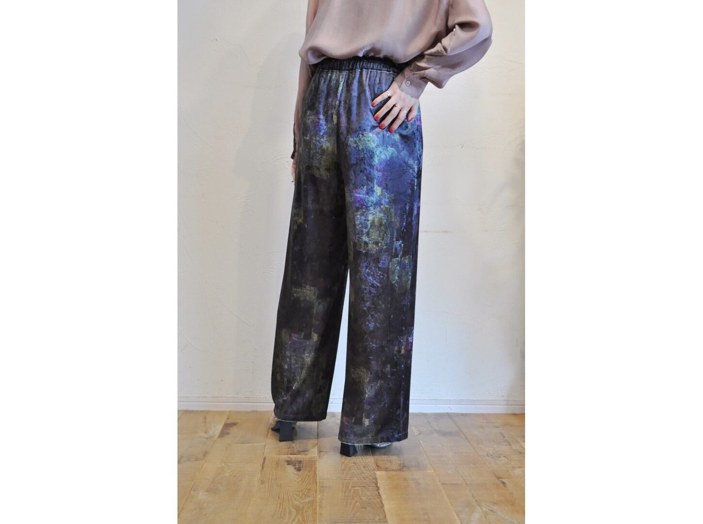 ●オリジナルのキャンバス柄を大胆な色合いで、落ち感のあるベロア生地にプリントした、インパクトがありながら洗練された印象のパンツ。