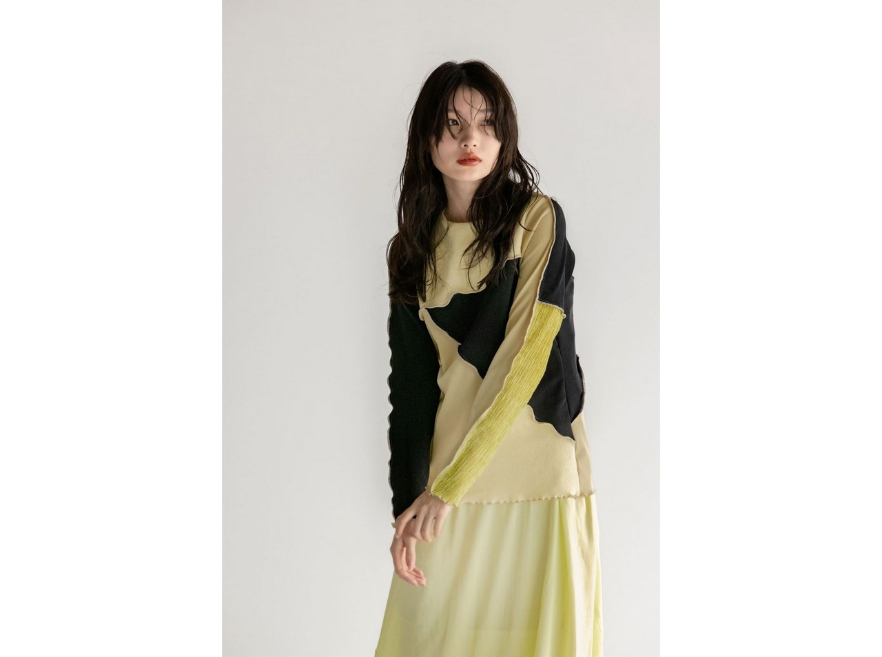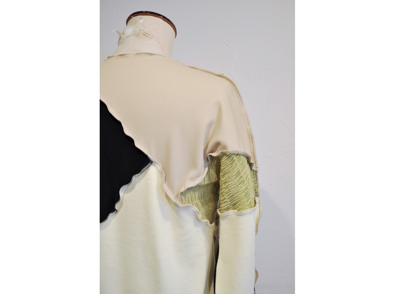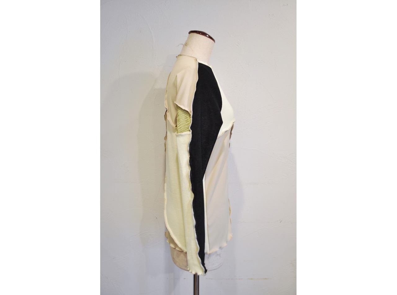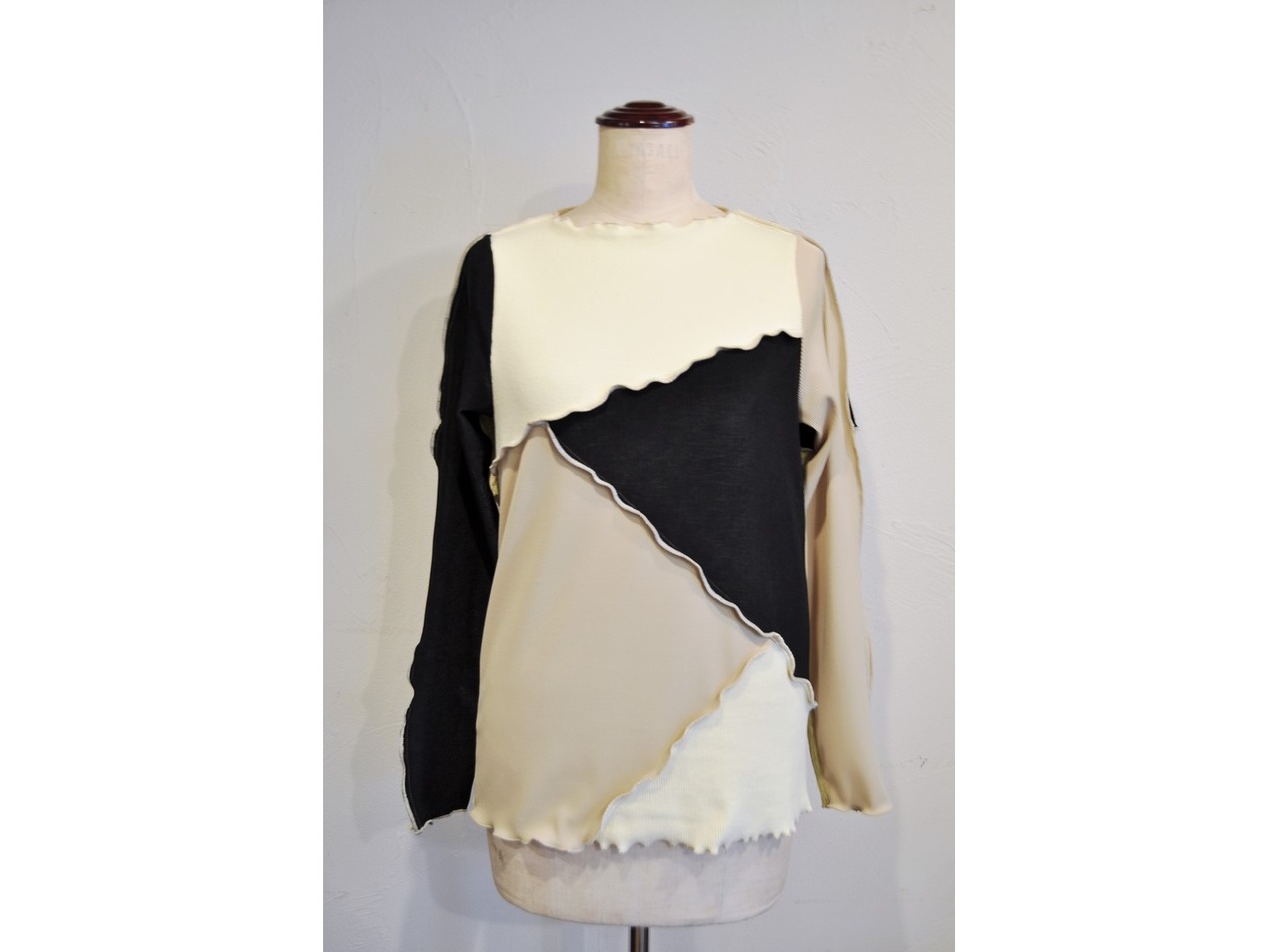 ●様々なリブ生地を大胆なカットでパッチワークしたロングスリーブトップス。
