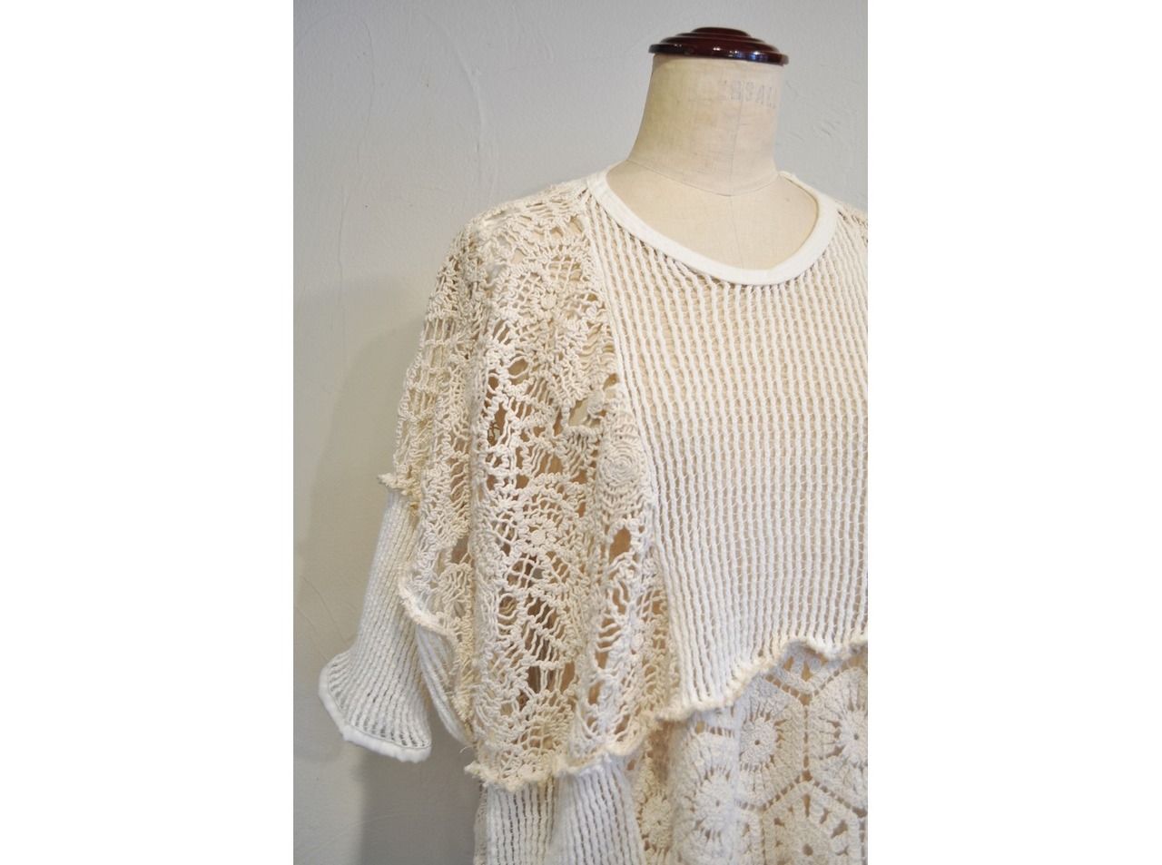 ●軍物のデンマークネットTシャツと、クロシェレースのパッチワークでつくられたカジュアルなデザインの短めトップスです。