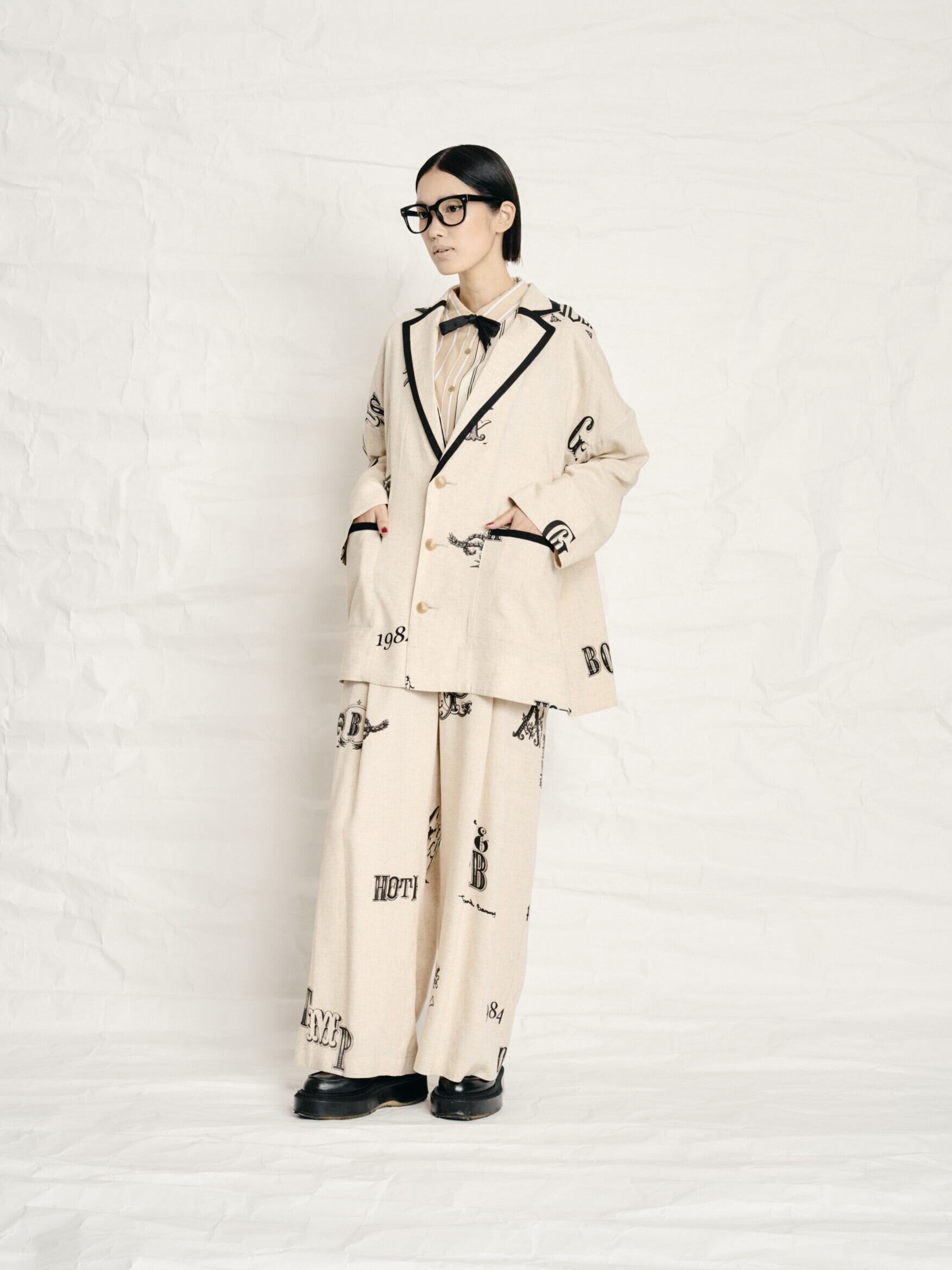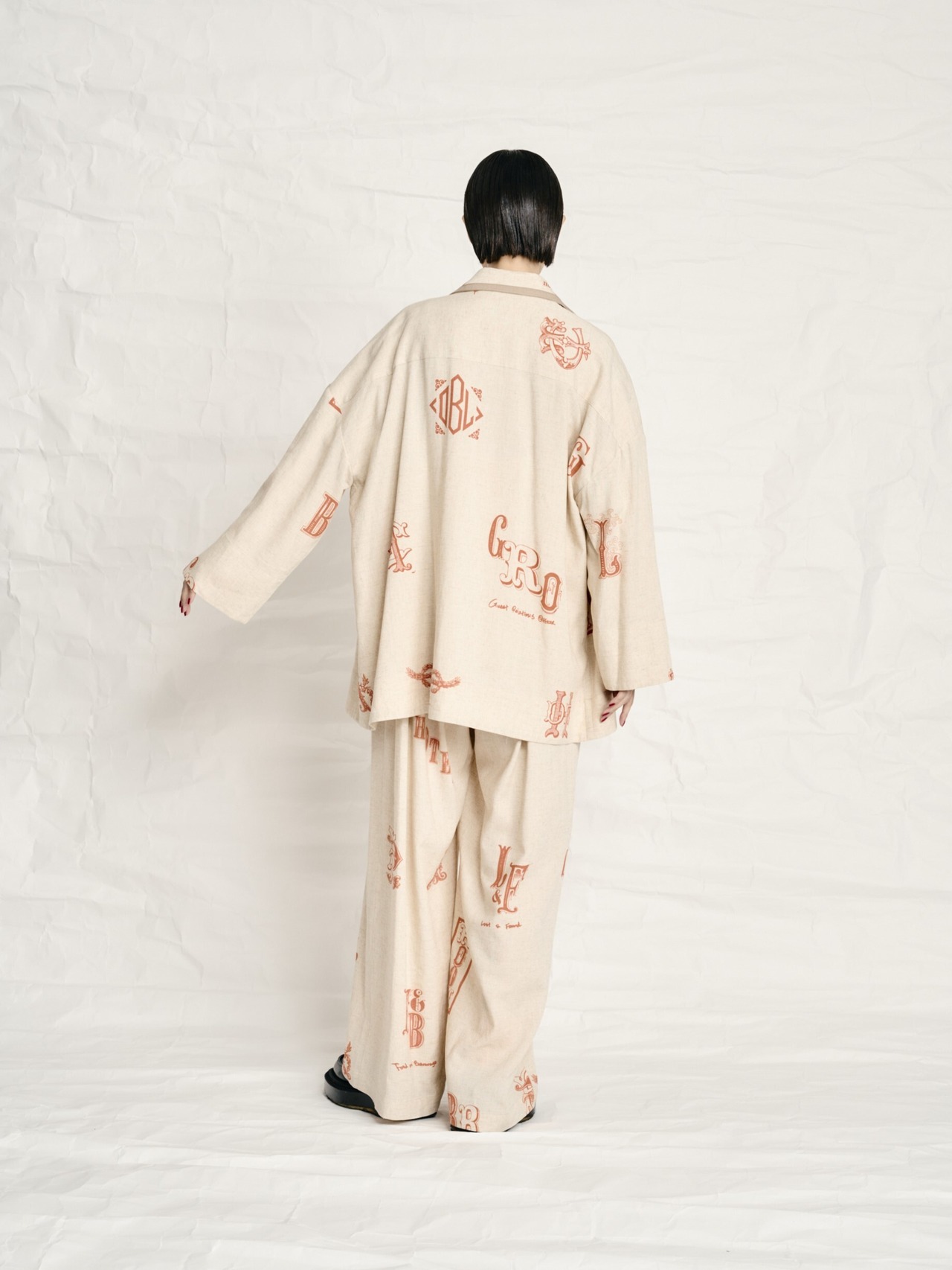 今回1番力を入れているのが、オリジナルプリントのテキスタイルです。このテキスタイルはホテルをテーマにしていてホテルでの専門用語をロゴマークにして柄を作ってみました。薄手のコットンリネンにブラックでプリントをしました。内容は専門的に使われる言葉で’’素泊まり’’や’’遺失物係’’ ’’アサイン部屋割り当て’’などの意味の頭文字だったりします。ホテルがとても好きで、一度フロントクラークをした経験があり、その頃使っていた専門用語の意味でプリントのロゴを考えました。