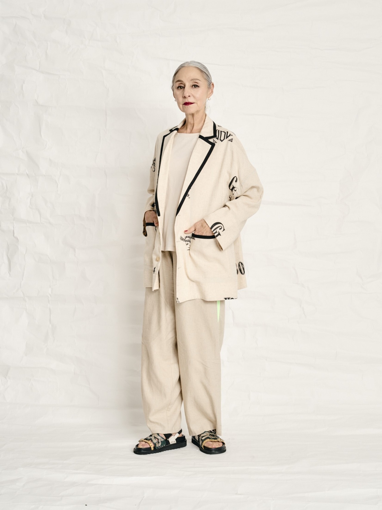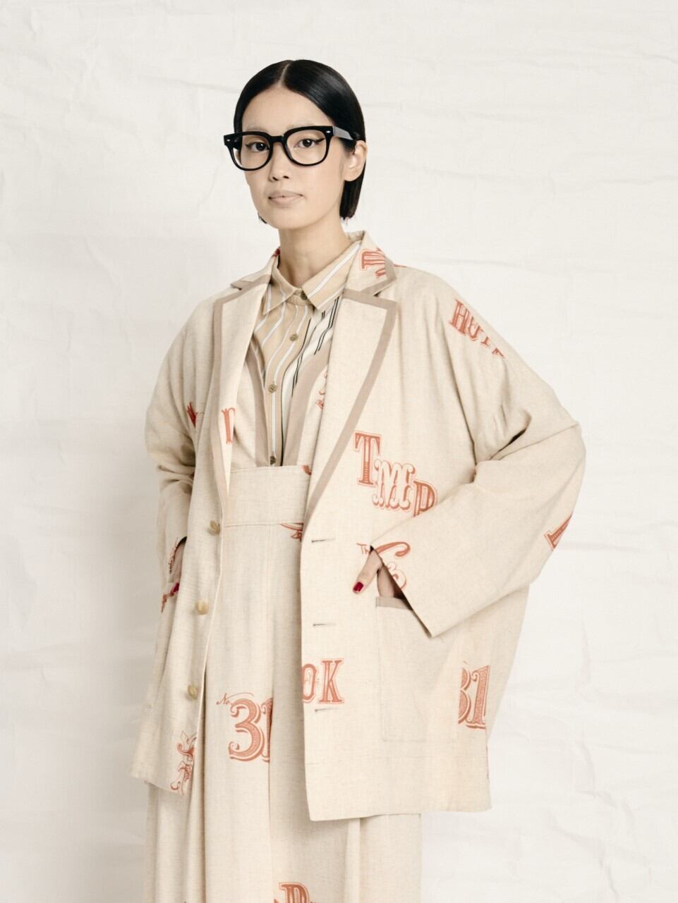 ジャケットは新型です。今回特徴ある襟のデザインにしました。襟部分にパイピングをつけて少しかっちりした印象です。ただし、かなり軽く羽織るためのジャケットなので芯を張ったりはせず、リネンの柔らかな雰囲気でカジュアルに羽織るタイプになっています。Tシャツ+パンツのシンプルなコーディネートに合わせるだけでちょっと華やかな印象になります。パッチポケットのポケット口にもパイピング仕様にしました。カジュアルながらもクラシカルな雰囲気がとても気に入っています。真夏にノースリーブの上に羽織ったり出来ます。裏地は付いていません。身長が小さい方は袖口を折り返しても着る事ができます。身頃はオーバーサイズにしていますので、体型をあまり気にする事なく着る事ができます。着丈はヒップが隠れる長さにしていますので、非常に着やすいのではないかなと思います。