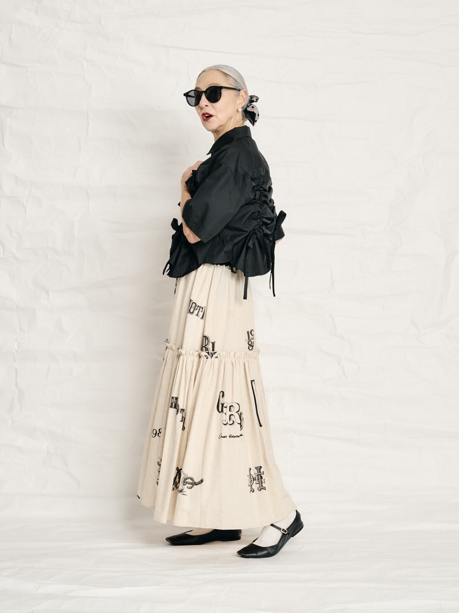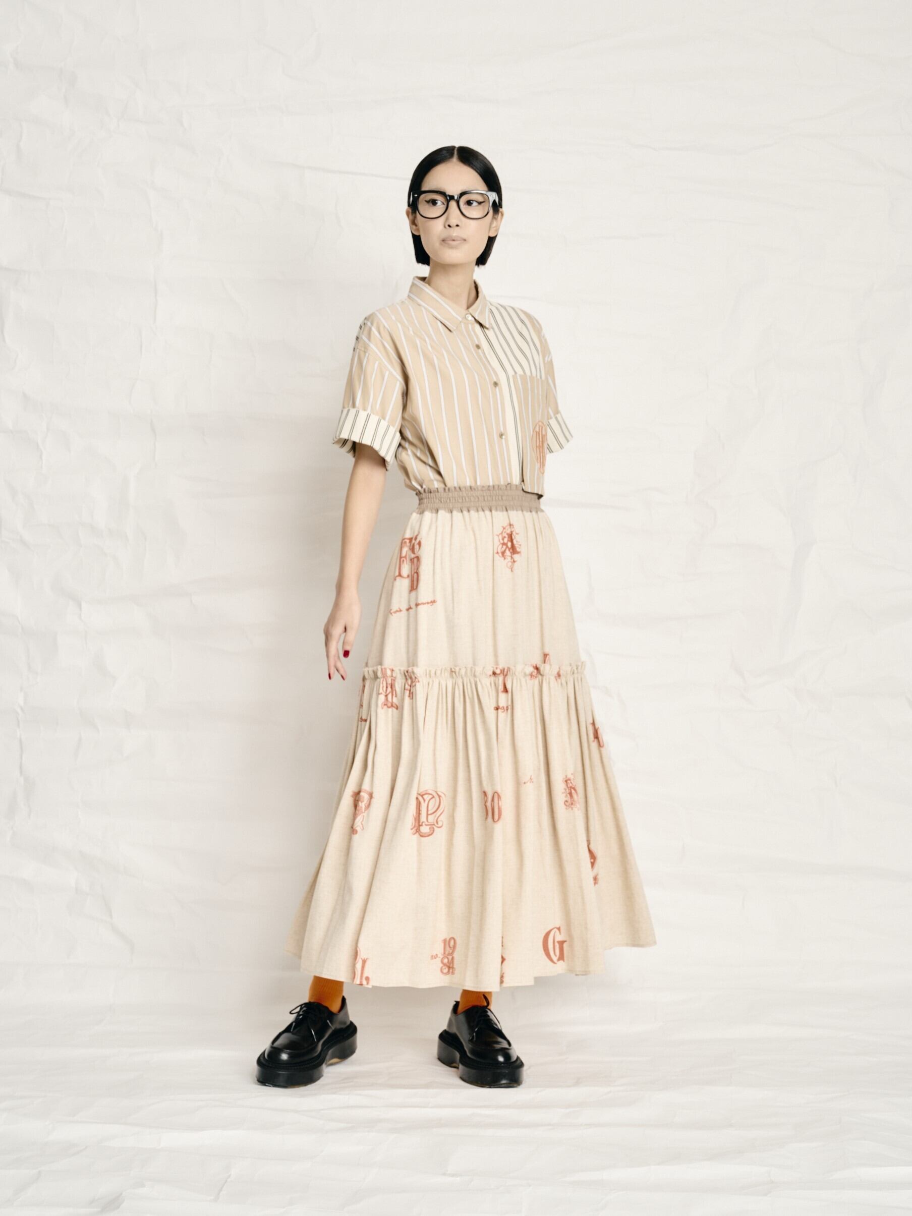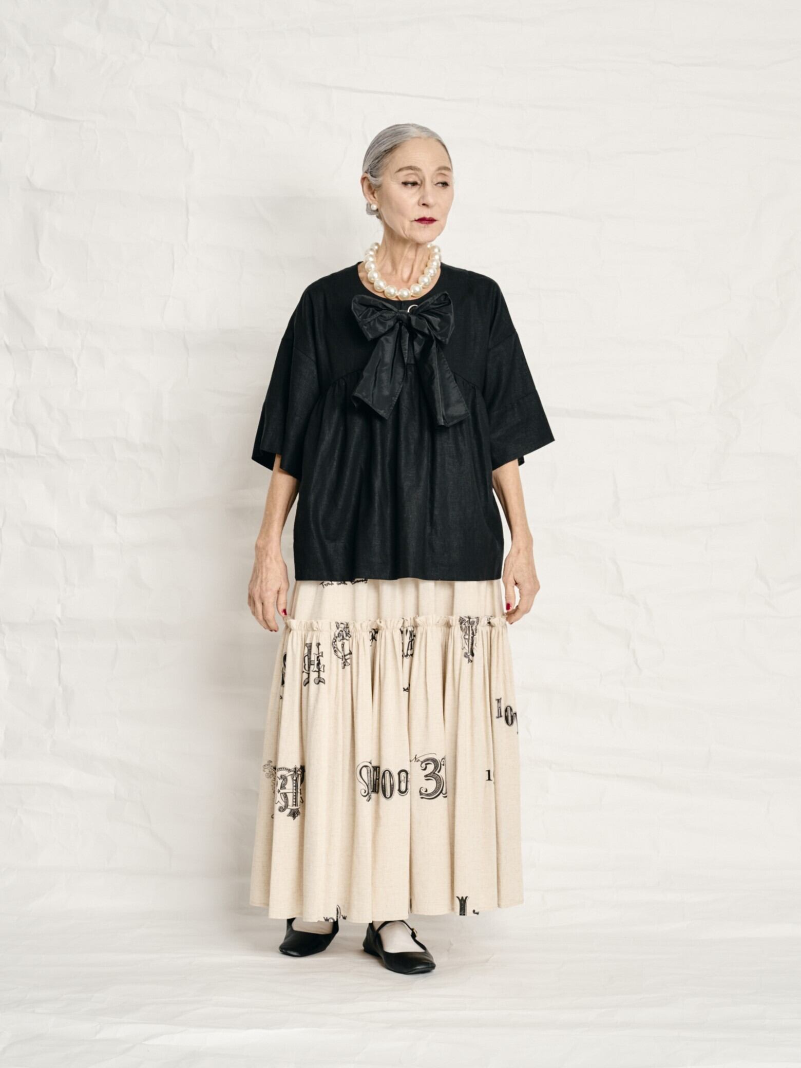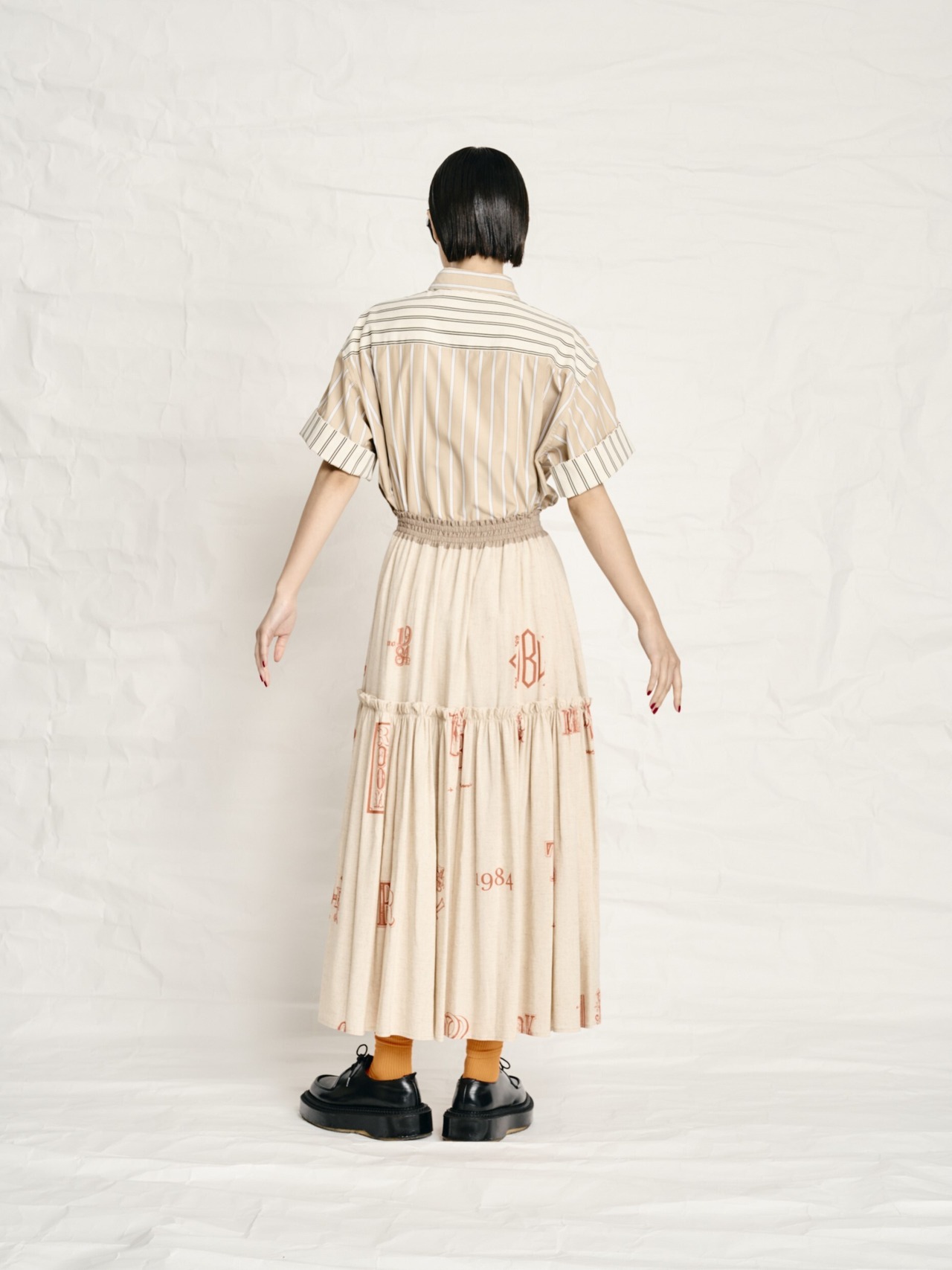 ギャザーたっぷりの贅沢感のあるスカートです。これでもかと言うほどのギャザーがガーリーでとても気に入っています。ヒップの部分はギャザーを少なくしてスッキリ見え、ヒップ下からフリルのように縫い代を出してギャザーを作っています。着丈は長めです。サンプルサイズは38の長い丈。36は5cm短くなります。ウエストは総ゴムでブラックのリネンに色を変えていて総ゴムながらウエストベルトを見せて着てもサマになります。柔らかなゴムなので、着丈で選んでいただいても良いかもしれません。38サイズの方が蹴回しが広くなり、たっぷりとして見えます。両サイドにポケット付き。春夏の暑い日に着ても涼しく合わせやすく便利に着こなしてもらえそうな1枚です。ジャケットとの相性、バランスもとても良くセットアップもとてもお勧めです。トップにはシャツが好相性でした。ベージュのストライプシャツでも、予約受付中のドローストリングのギャザーのホワイトシャツにも合わせやすかったです。ほどよく柄がポイントになっていて、単色のような使い勝手ですが、オシャレ感のあるアイテムが出来上がったように感じています。素材のナチュラルさも魅力的でとても大好きなスカートになりました。