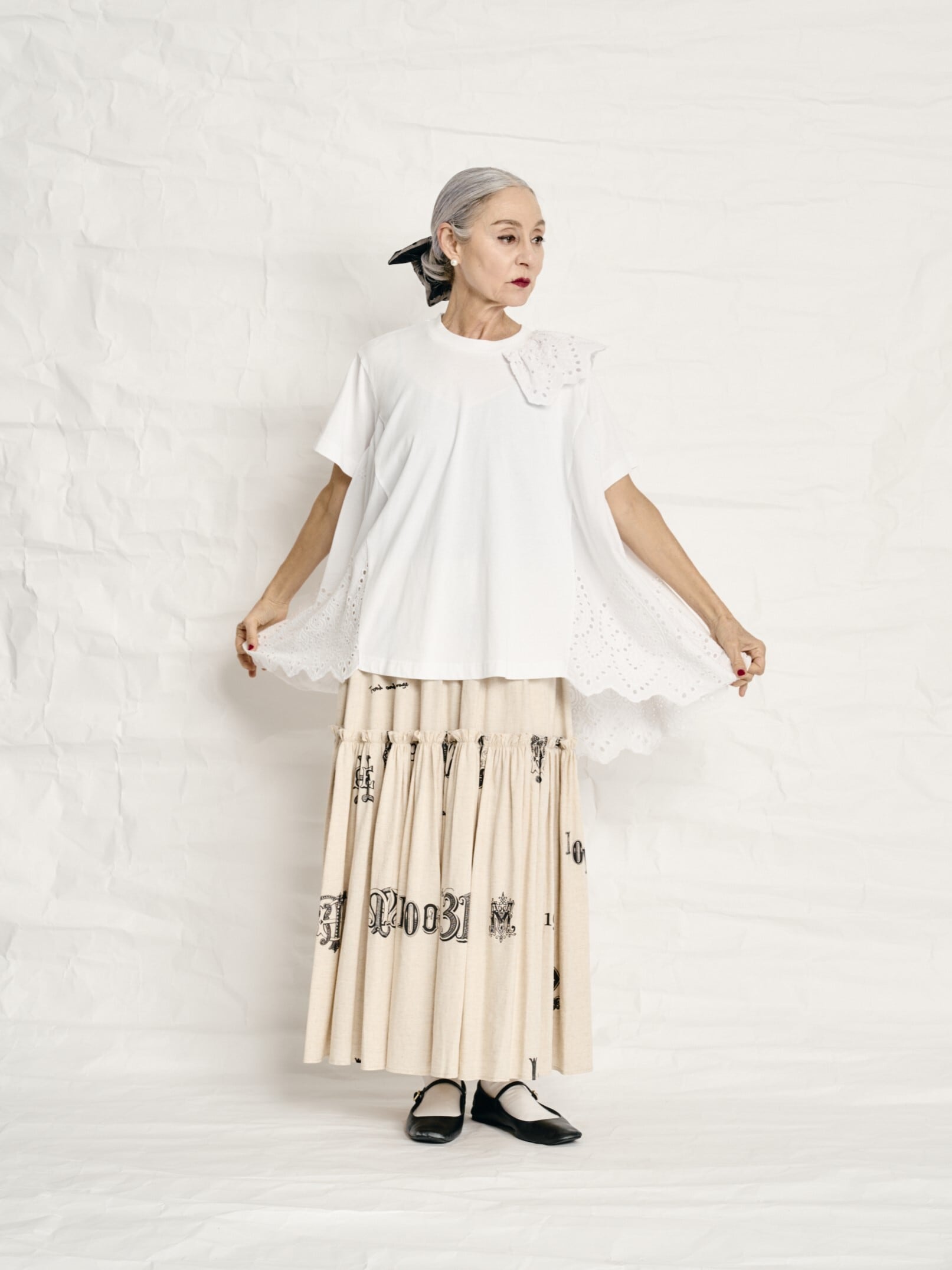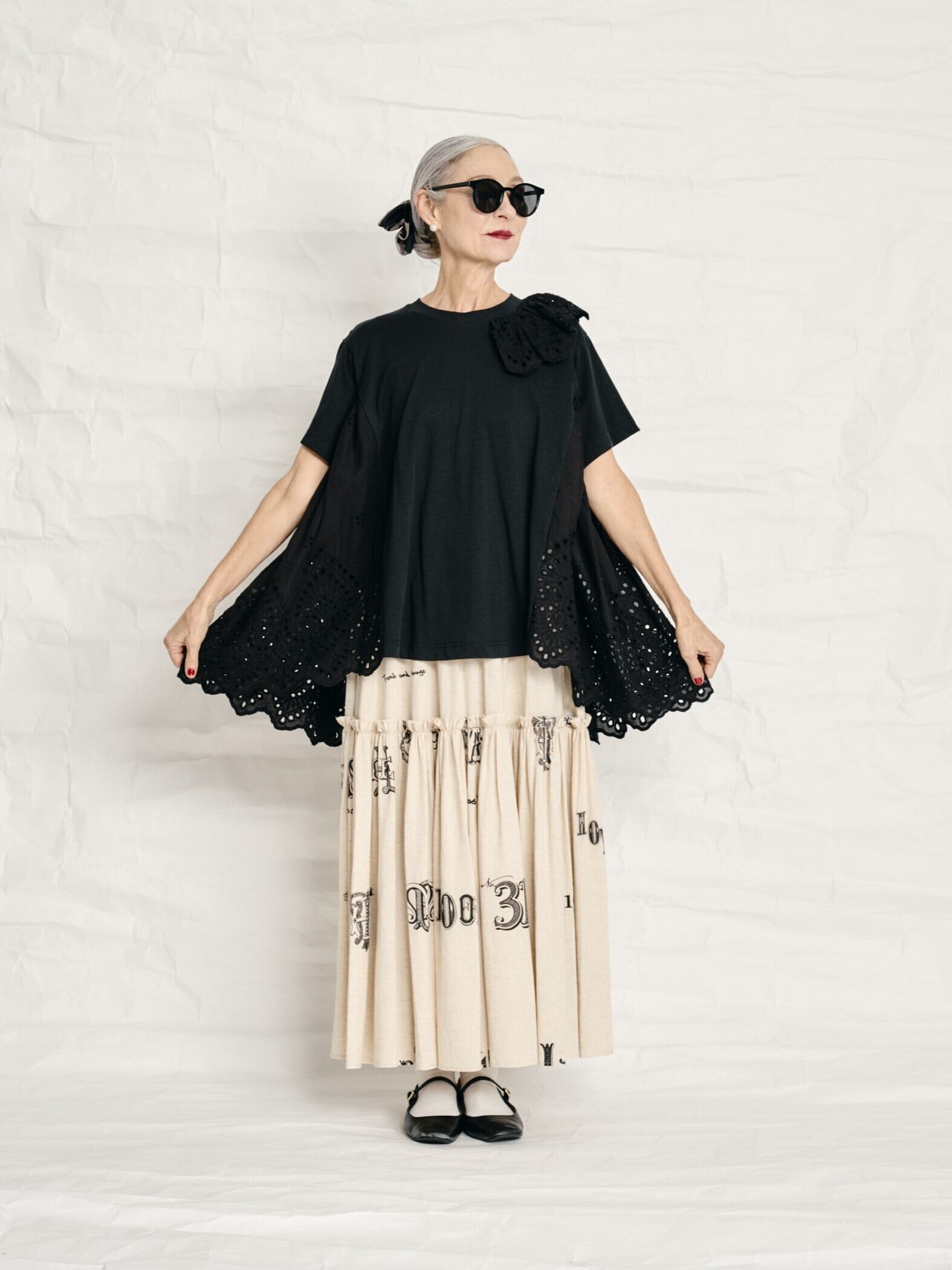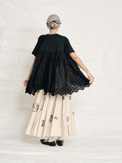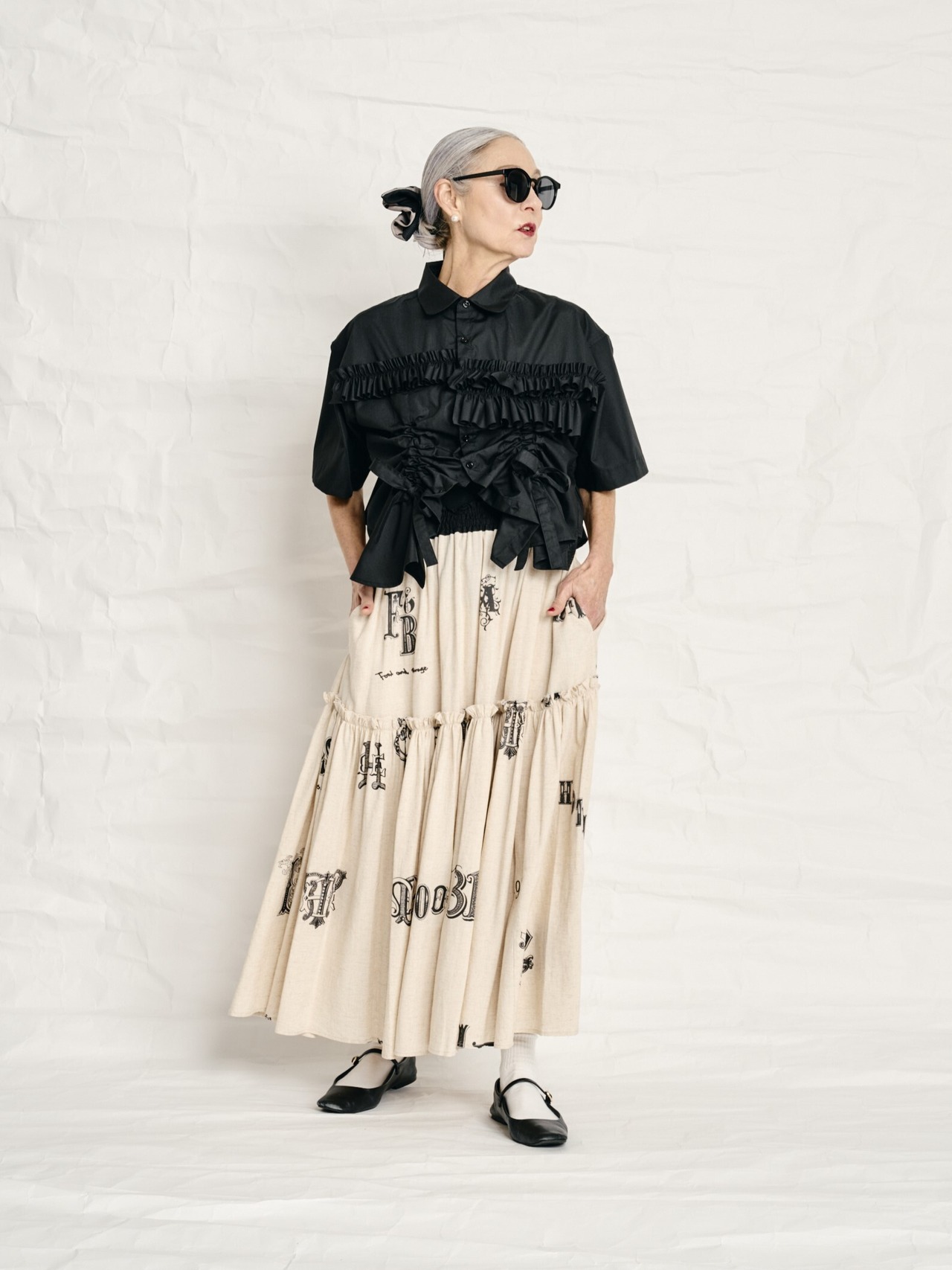 ギャザーたっぷりの贅沢感のあるスカートです。これでもかと言うほどのギャザーがガーリーでとても気に入っています。ヒップの部分はギャザーを少なくしてスッキリ見え、ヒップ下からフリルのように縫い代を出してギャザーを作っています。着丈は長めです。サンプルサイズは38の長い丈。36は5cm短くなります。ウエストは総ゴムでブラックのリネンに色を変えていて総ゴムながらウエストベルトを見せて着てもサマになります。柔らかなゴムなので、着丈で選んでいただいても良いかもしれません。38サイズの方が蹴回しが広くなり、たっぷりとして見えます。両サイドにポケット付き。春夏の暑い日に着ても涼しく合わせやすく便利に着こなしてもらえそうな1枚です。ジャケットとの相性、バランスもとても良くセットアップもとてもお勧めです。トップにはシャツが好相性でした。ベージュのストライプシャツでも、予約受付中のドローストリングのギャザーのホワイトシャツにも合わせやすかったです。ほどよく柄がポイントになっていて、単色のような使い勝手ですが、オシャレ感のあるアイテムが出来上がったように感じています。素材のナチュラルさも魅力的でとても大好きなスカートになりました。