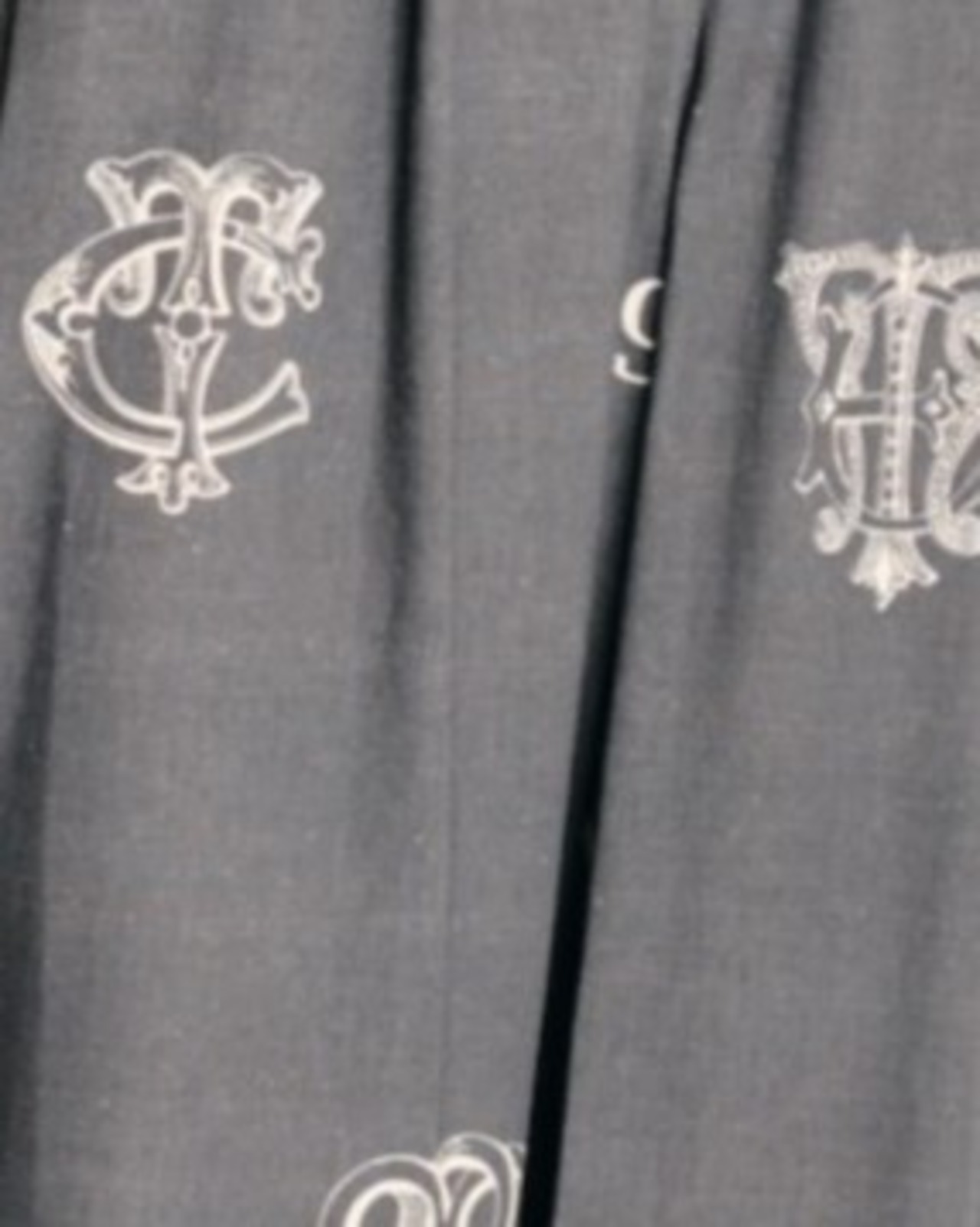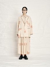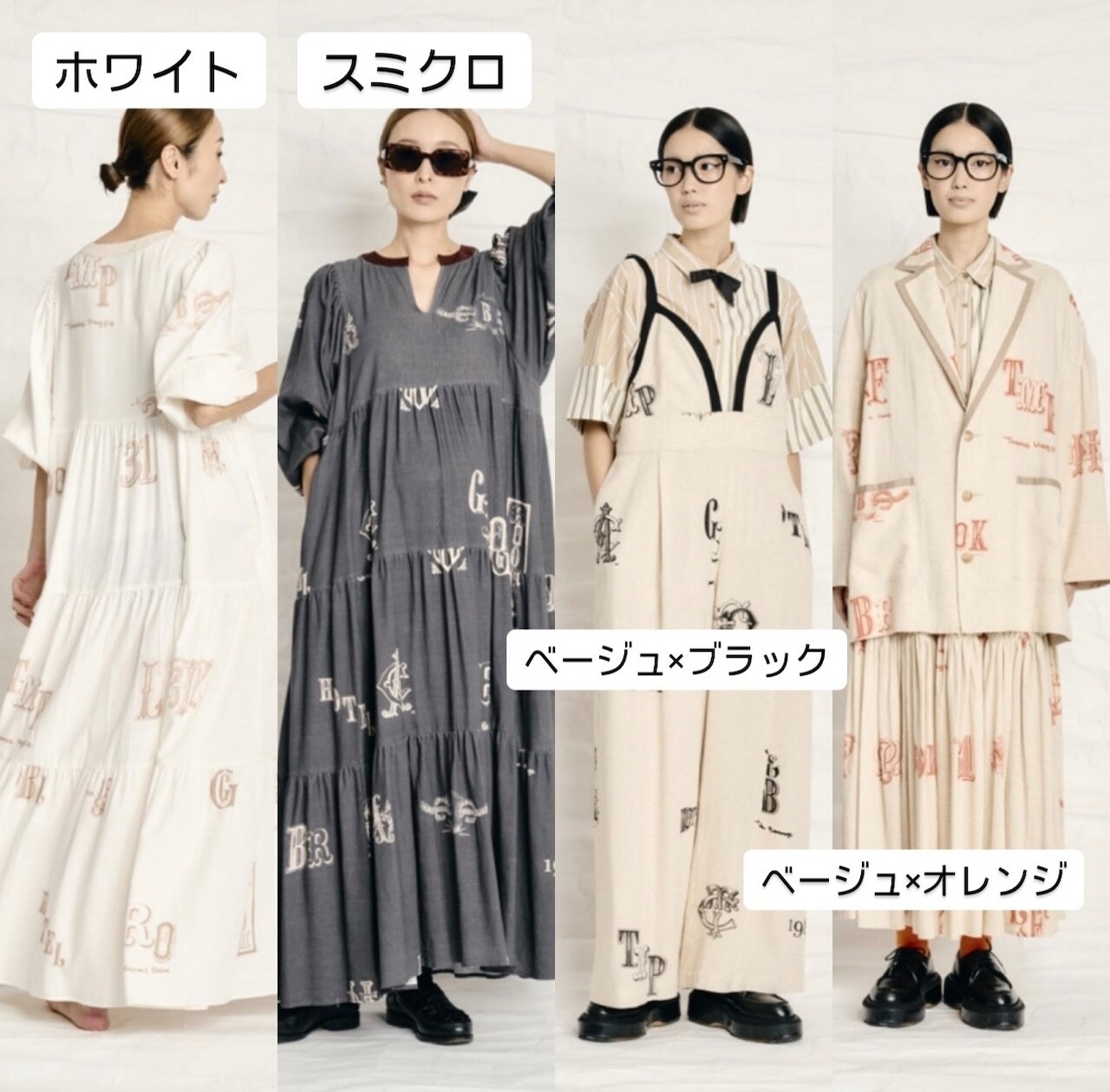 今回1番力を入れているのが、オリジナルプリントのテキスタイルです。このテキスタイルはホテルをテーマにしていてホテルでの専門用語をロゴマークにして柄を作ってみました。薄手のコットンリネンにブラックでプリントをしました。内容は専門的に使われる言葉で’’素泊まり’’や’’遺失物係’’ ’’アサイン部屋割り当て’’などの意味の頭文字だったりします。ホテルがとても好きで、一度フロントクラークをした経験があり、その頃使っていた専門用語の意味でプリントのロゴを考えました。