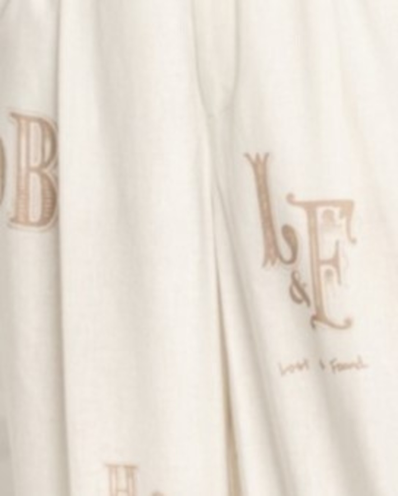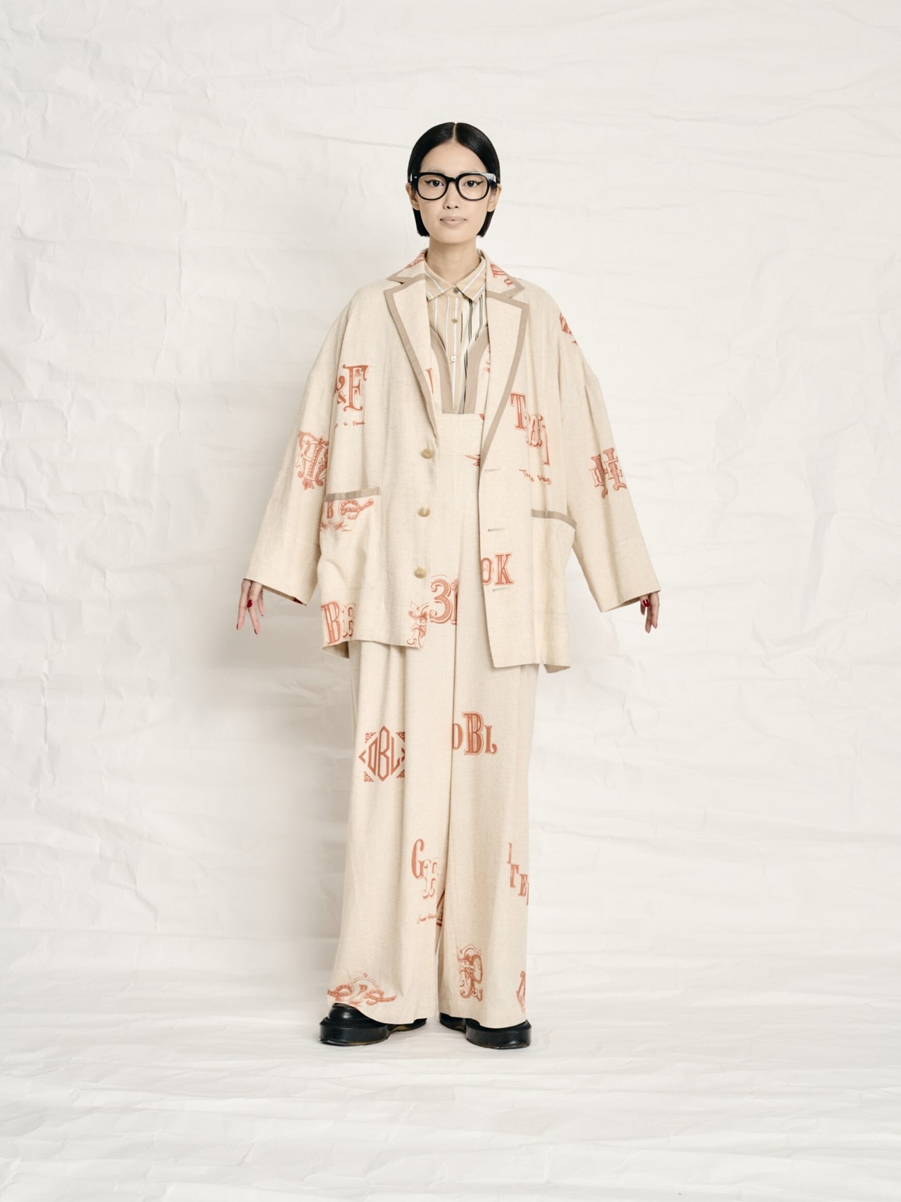 今回1番力を入れているのが、オリジナルプリントのテキスタイルです。このテキスタイルはホテルをテーマにしていてホテルでの専門用語をロゴマークにして柄を作ってみました。薄手のコットンリネンにブラックでプリントをしました。内容は専門的に使われる言葉で’’素泊まり’’や’’遺失物係’’ ’’アサイン部屋割り当て’’などの意味の頭文字だったりします。ホテルがとても好きで、一度フロントクラークをした経験があり、その頃使っていた専門用語の意味でプリントのロゴを考えました。