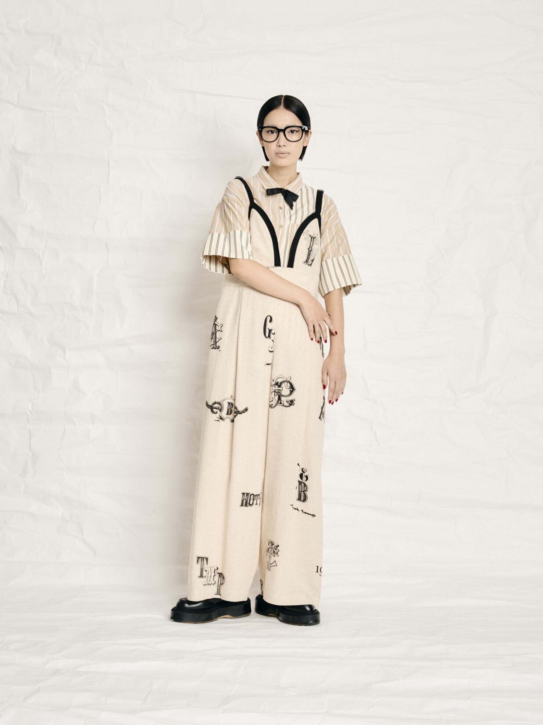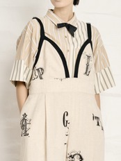 毎回、圧倒的な人気のサロペットです。今回のサロペットは以前と同じようなシルエットではありますが、薄手でさらにゆったりとしています。胸の部分はパイピングにしてみました。パイピングがあることで、上半身がスッキリとした印象になります。着用サンプルは36サイズです。肩のストラップは調節がかなり出来るので身長に関係なく合わせることができます。身長が152cm以下の方は、もしかするとパンツのカットが必要になるかもしれません。股上は非常にゆとりがあります。また背中部分にゴムが入っている為、ウエストサイズもそれほど気になりません。比較的ふくよかな方から、とても細身の方まで、サマになる着こなしが楽しめると思いました。インナーにはTシャツでもブラウスでも、柄物なのに合わせやすかったです。ジャケットを合わせてセットアップが非常にお勧めです。スタッフにの絶賛のルックになっていて、モデルのアンヌマリーが着用している姿がとても素敵でした。私もこのセットアップで来年の春夏にチャレンジしてみたいと思っています。