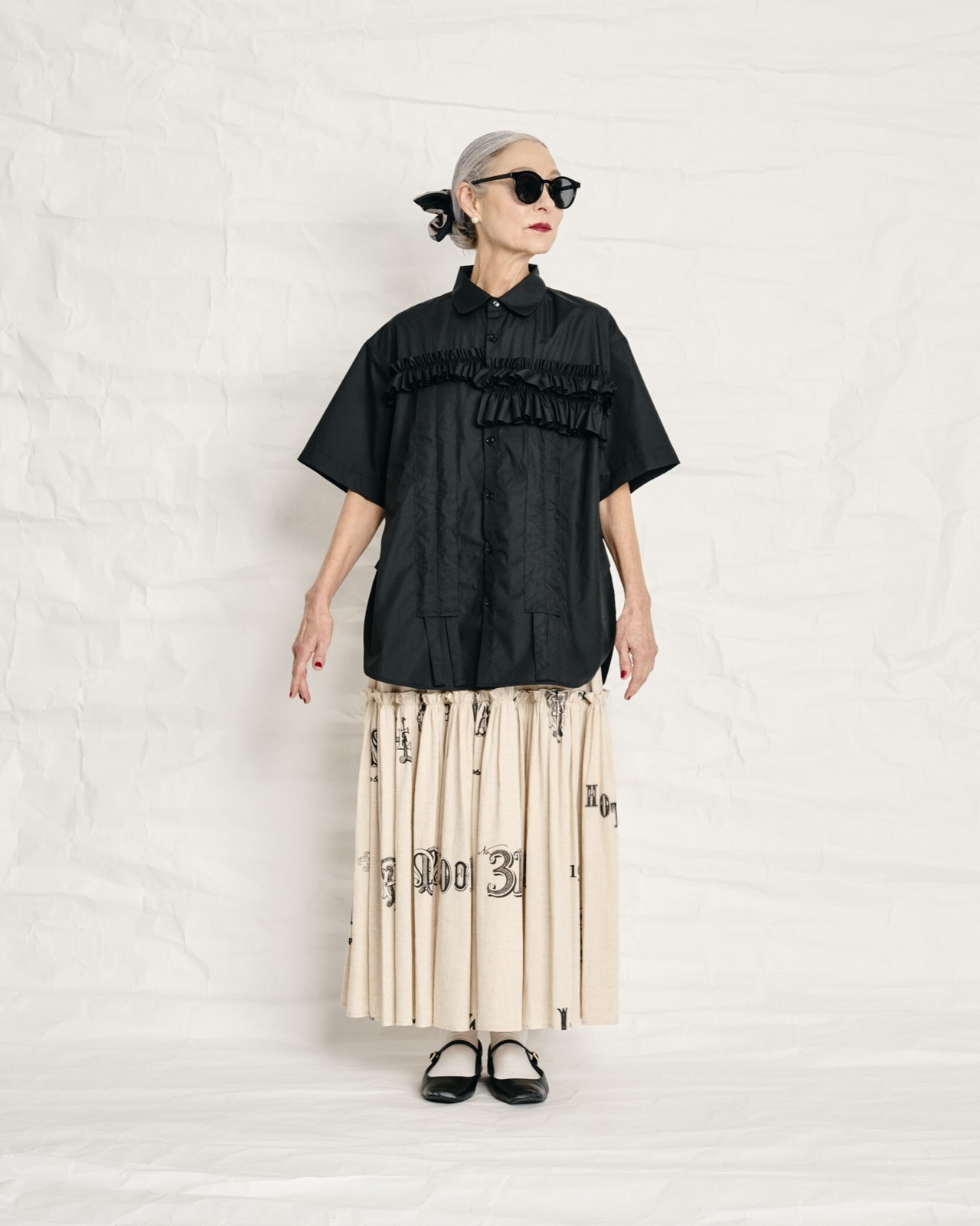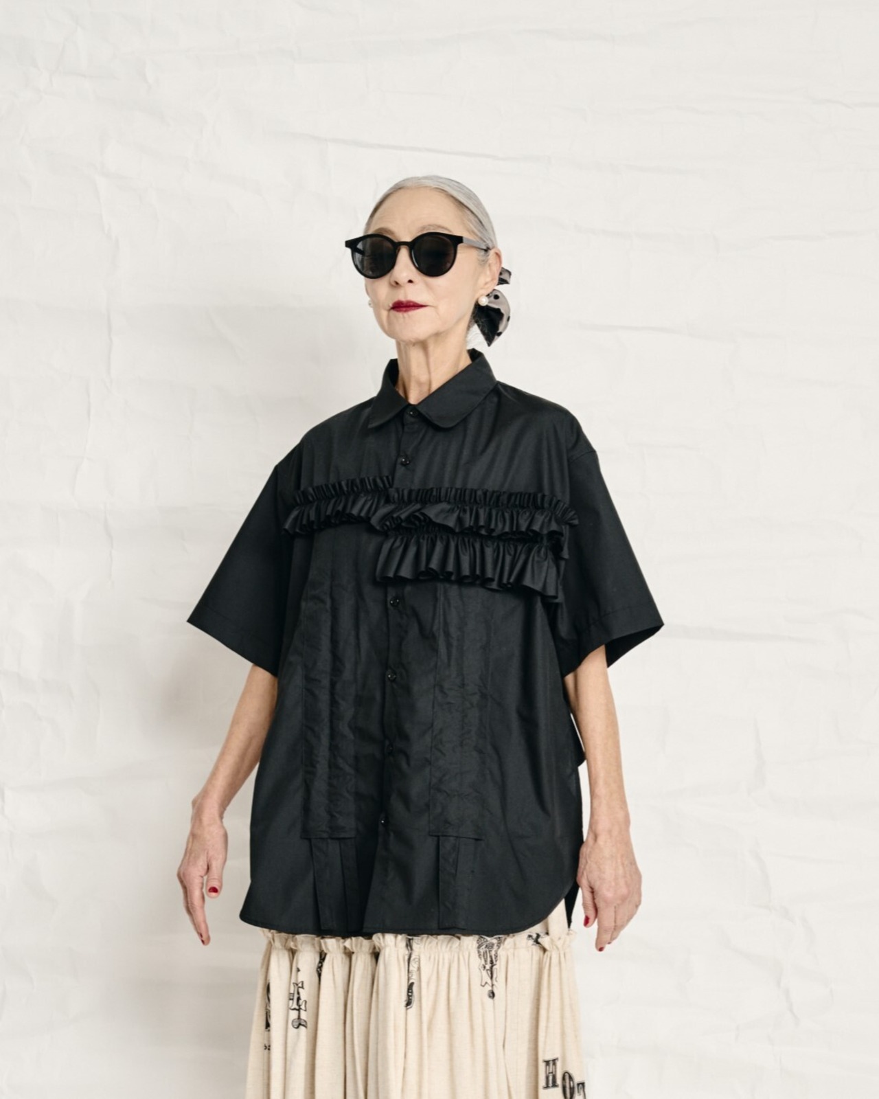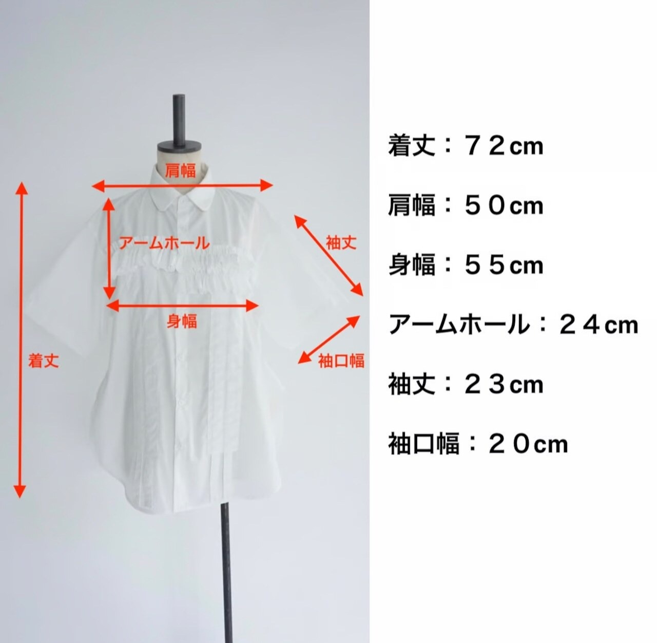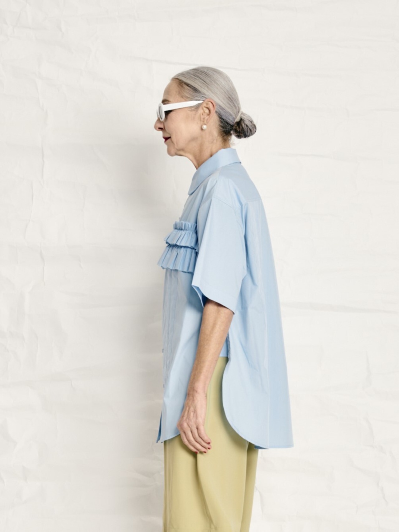 いつものノーアイロンで使えるコットンポリエステルのコットンライクなシャツ。今年はちょっとひと捻りしてみました。胸に細かいフリルをつけて、裾から胸までドローストリングできるデザインです。前身頃、後ろ身頃どちらも絞って好きなギャザーにデザインができるようになっています。リボンを絞らなくても着ることも可能なので普通のシャツ感覚でも使えます。綺麗に広がりが出るように、サイドには生地を増やしてバランスよく広がるようにパターンで工夫をしています。何度か試作をしてみて絞りとのバランスを考慮した作りになっています。私は今回のデザインの中で1番着たいシャツでした。華やかさと個性があり、甘くにもモードにも見えるところが気に入っています。シャツの襟は少しだけ角丸にしてみました。普通襟のようなパターンですが、これまでになかった角丸の襟先も好みでした。ボトムによって絞りのバランスを変えて着てみてください。また素材はとても心地良い素材です。着心地と華やかさがあるので普段にも改まったお食事のお席でも着ていただく事ができると思います。私もこれだけは絶対に着たいと思っている、とてもお勧めのシャツです。