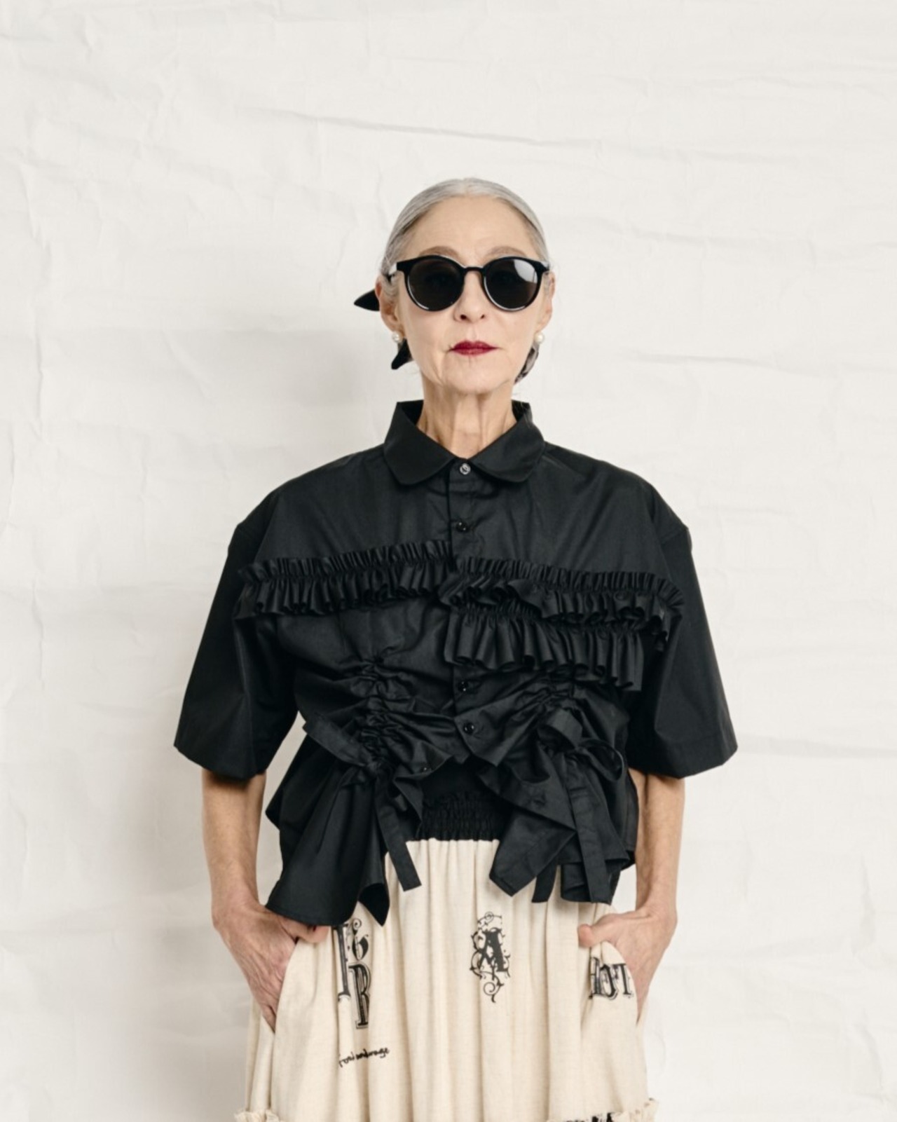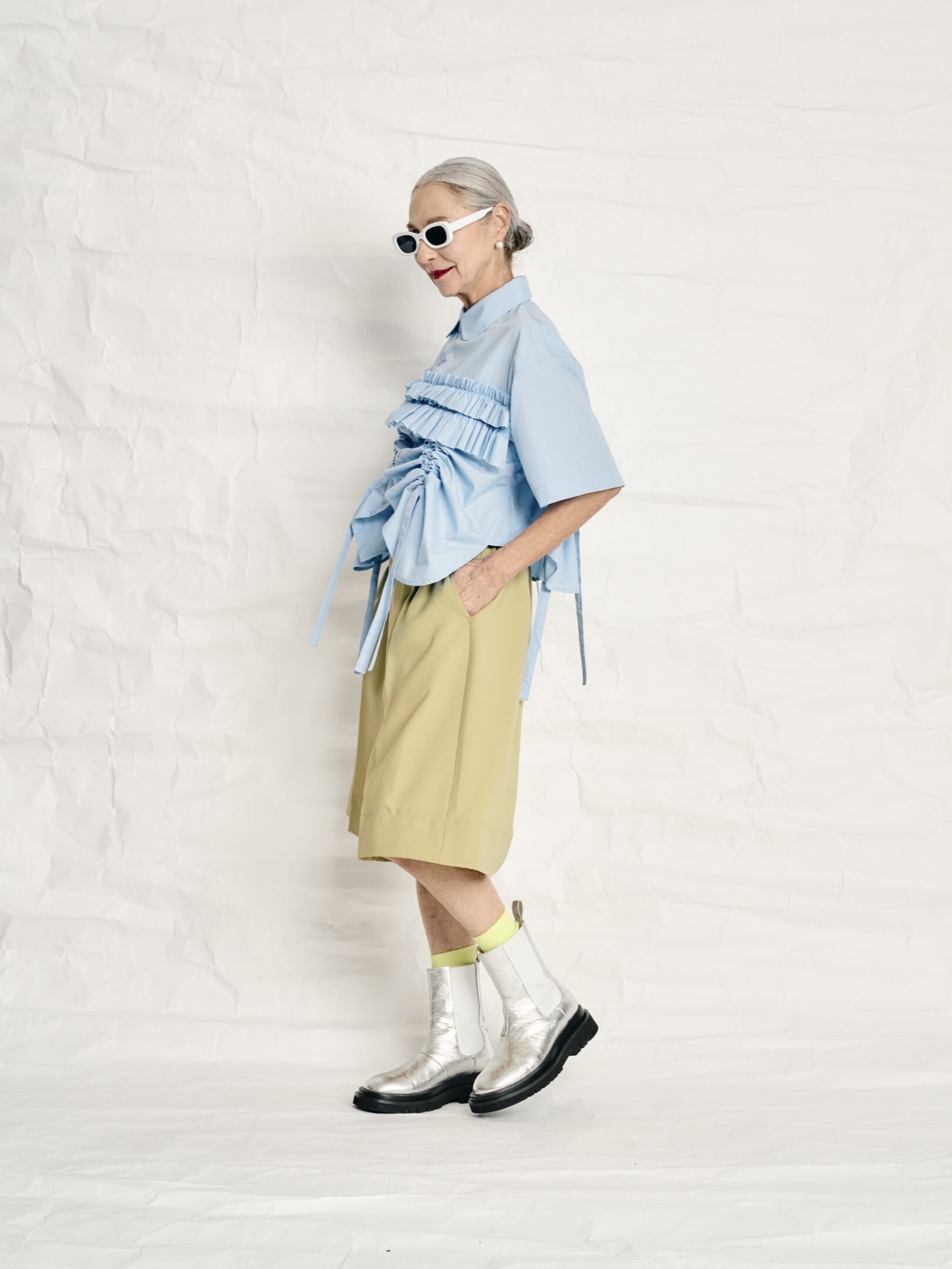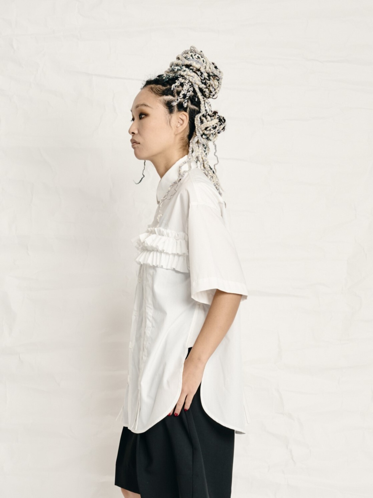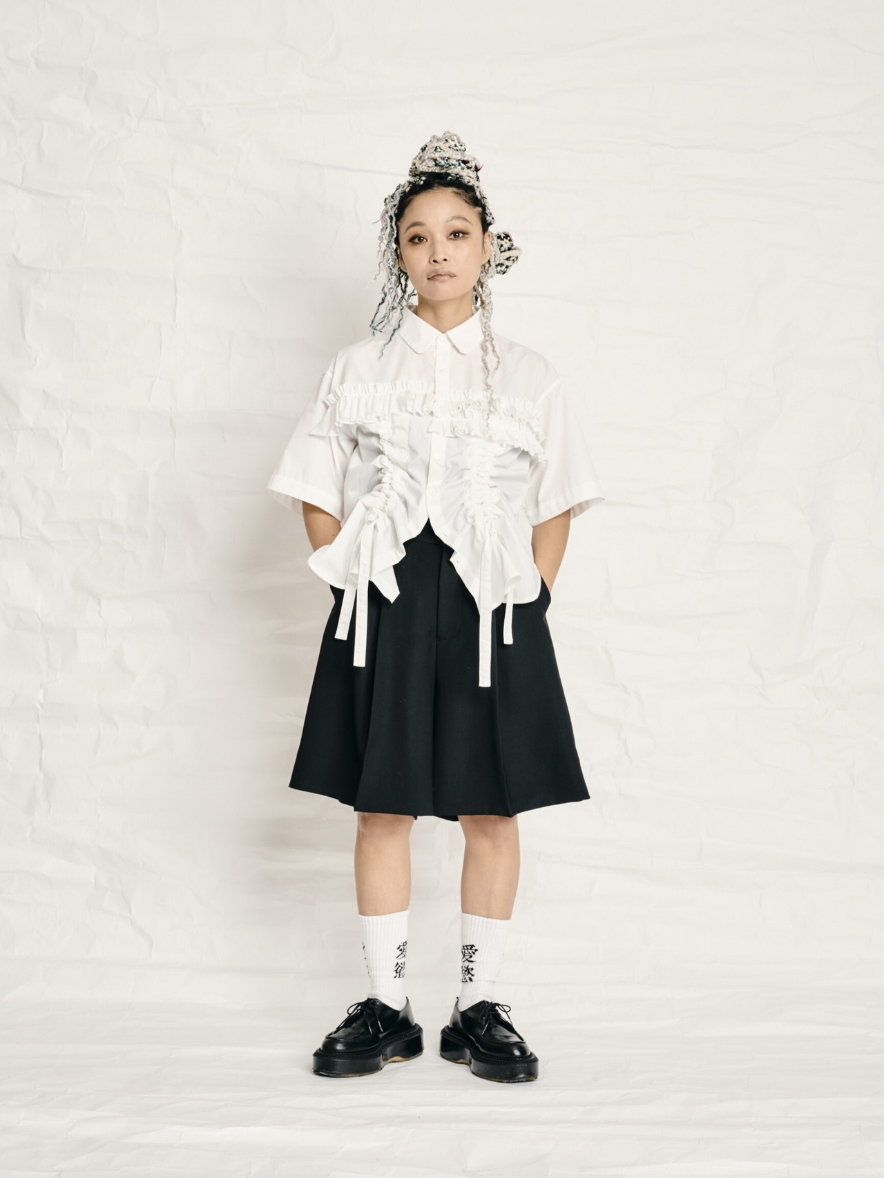 いつものノーアイロンで使えるコットンポリエステルのコットンライクなシャツ。今年はちょっとひと捻りしてみました。胸に細かいフリルをつけて、裾から胸までドローストリングできるデザインです。前身頃、後ろ身頃どちらも絞って好きなギャザーにデザインができるようになっています。リボンを絞らなくても着ることも可能なので普通のシャツ感覚でも使えます。綺麗に広がりが出るように、サイドには生地を増やしてバランスよく広がるようにパターンで工夫をしています。何度か試作をしてみて絞りとのバランスを考慮した作りになっています。私は今回のデザインの中で1番着たいシャツでした。華やかさと個性があり、甘くにもモードにも見えるところが気に入っています。シャツの襟は少しだけ角丸にしてみました。普通襟のようなパターンですが、これまでになかった角丸の襟先も好みでした。ボトムによって絞りのバランスを変えて着てみてください。また素材はとても心地良い素材です。着心地と華やかさがあるので普段にも改まったお食事のお席でも着ていただく事ができると思います。私もこれだけは絶対に着たいと思っている、とてもお勧めのシャツです。