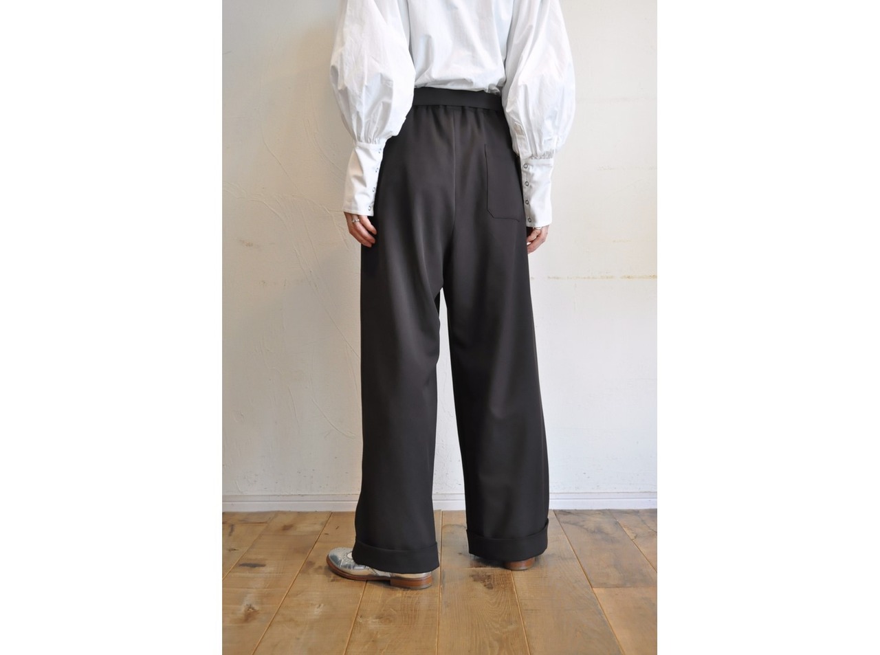 ウエストのバックはゴムで、裾はダブル仕様になっています。