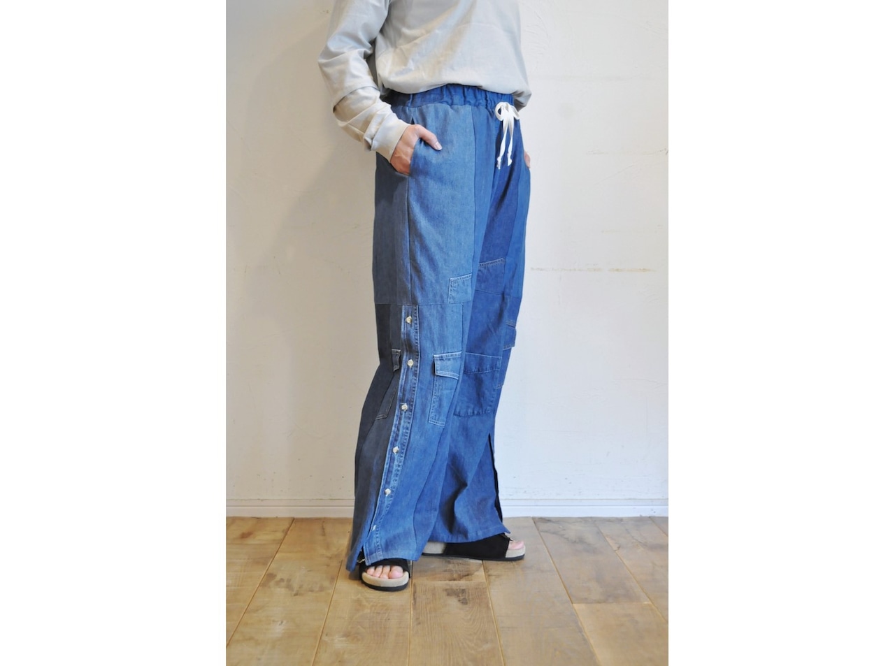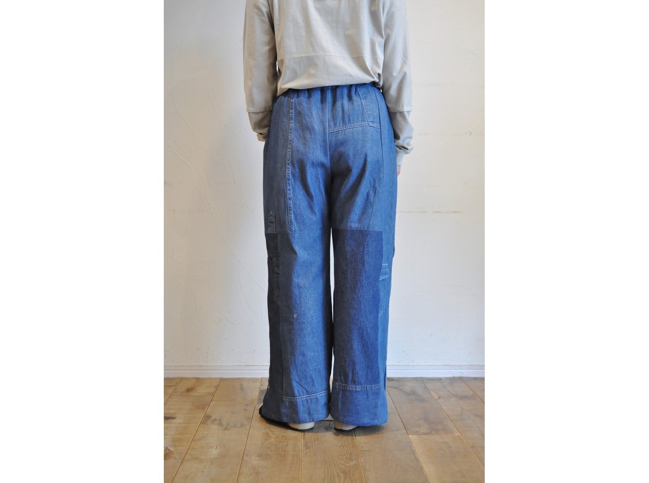 ●古着のダンガリーシャツを使用して仕立てたパッチワークパンツ。