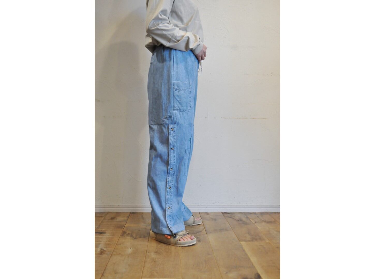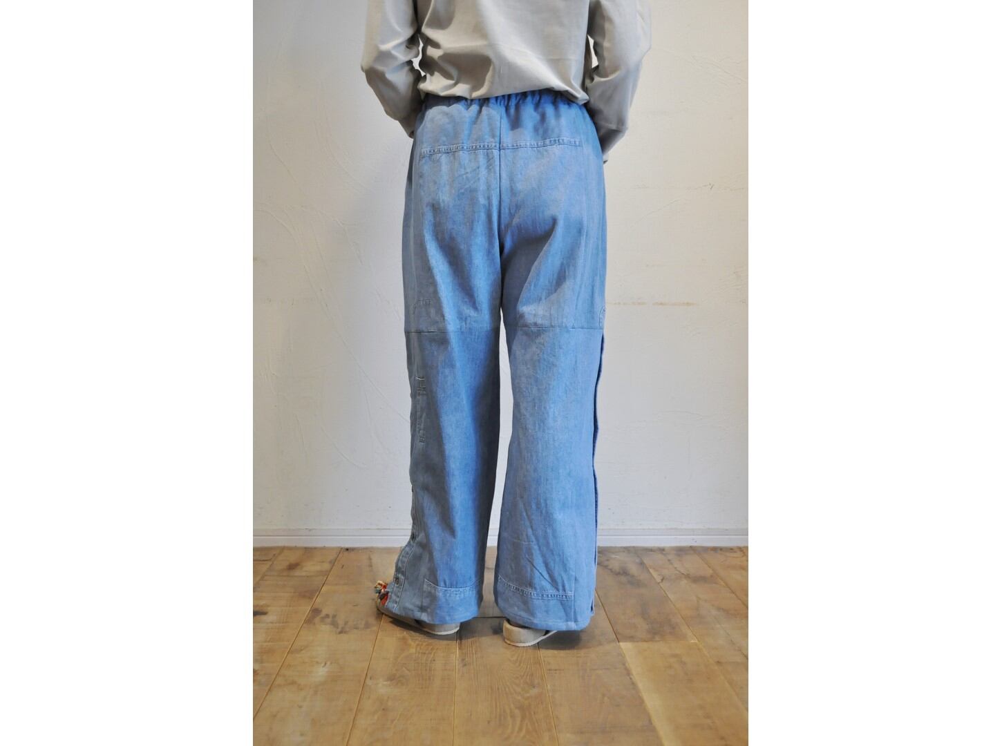●古着のダンガリーシャツを使用して仕立てたパッチワークパンツ。