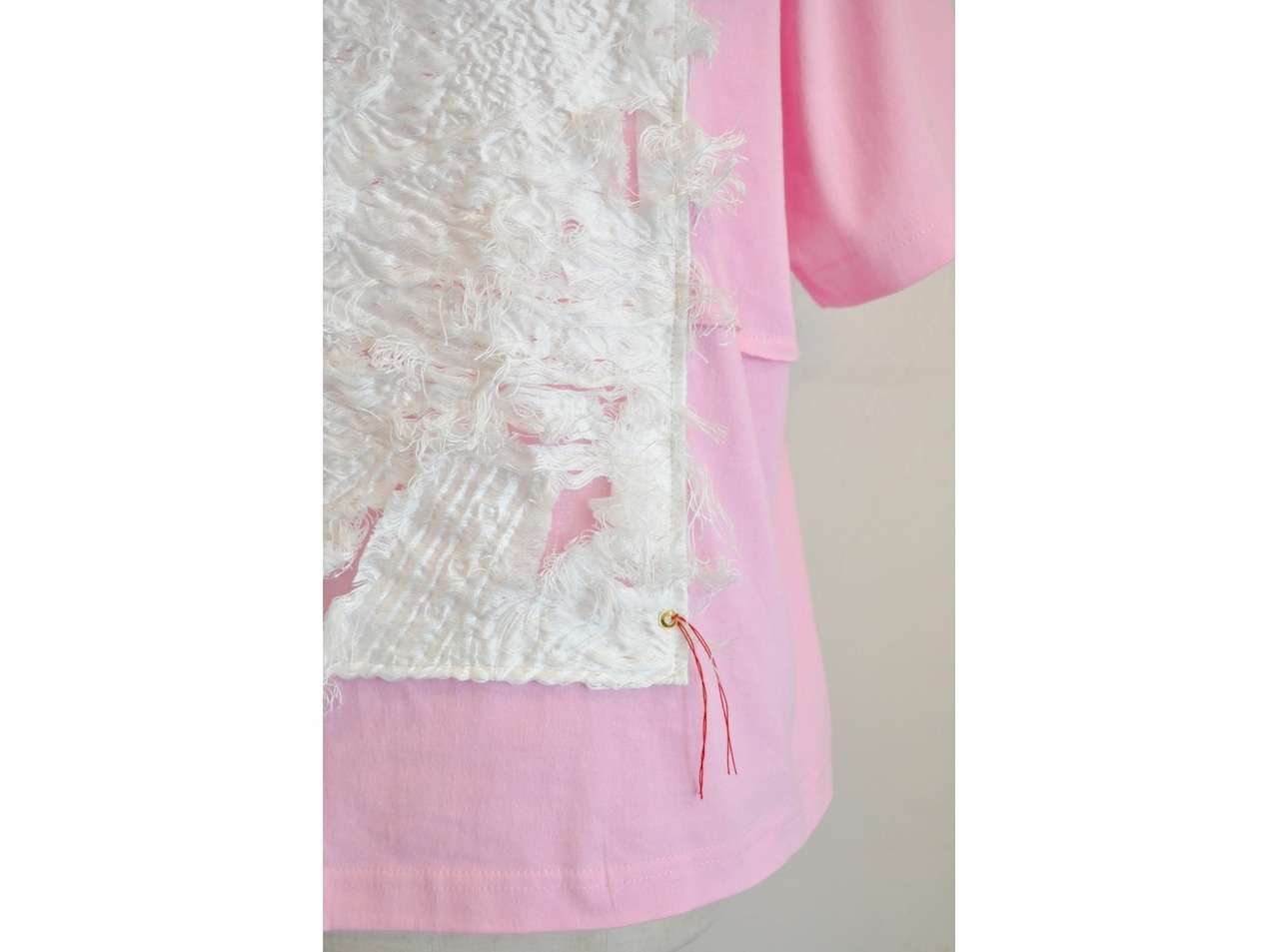 ●ビッグシルエットのTシャツをベースに、オーガンジージャガード生地を縫い当てた、シンプルながらインパクトのある一着。