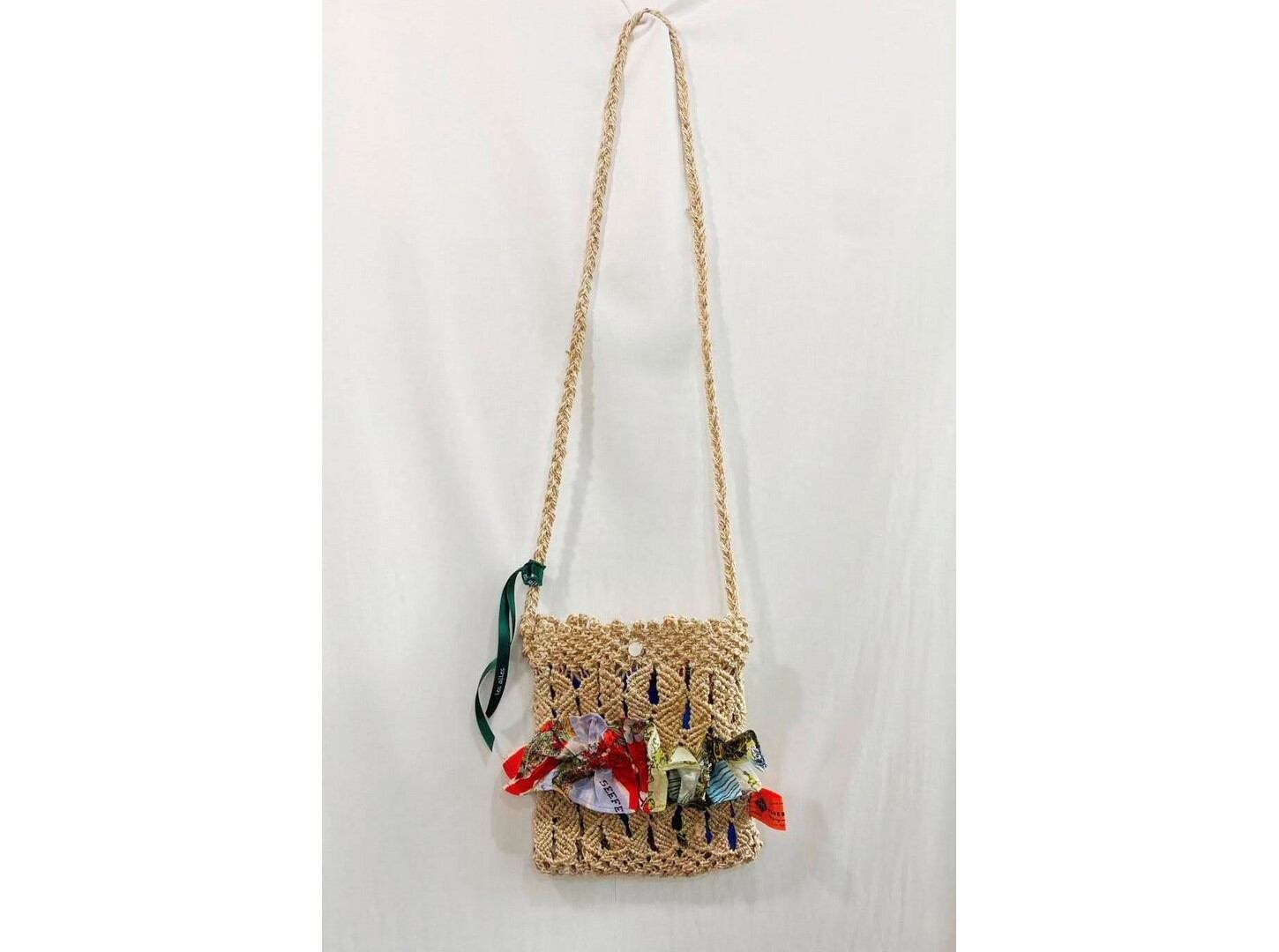 ●小ぶりなジュートバッグをベースに、古着スカーフで内布やフリルがあしらわれています。