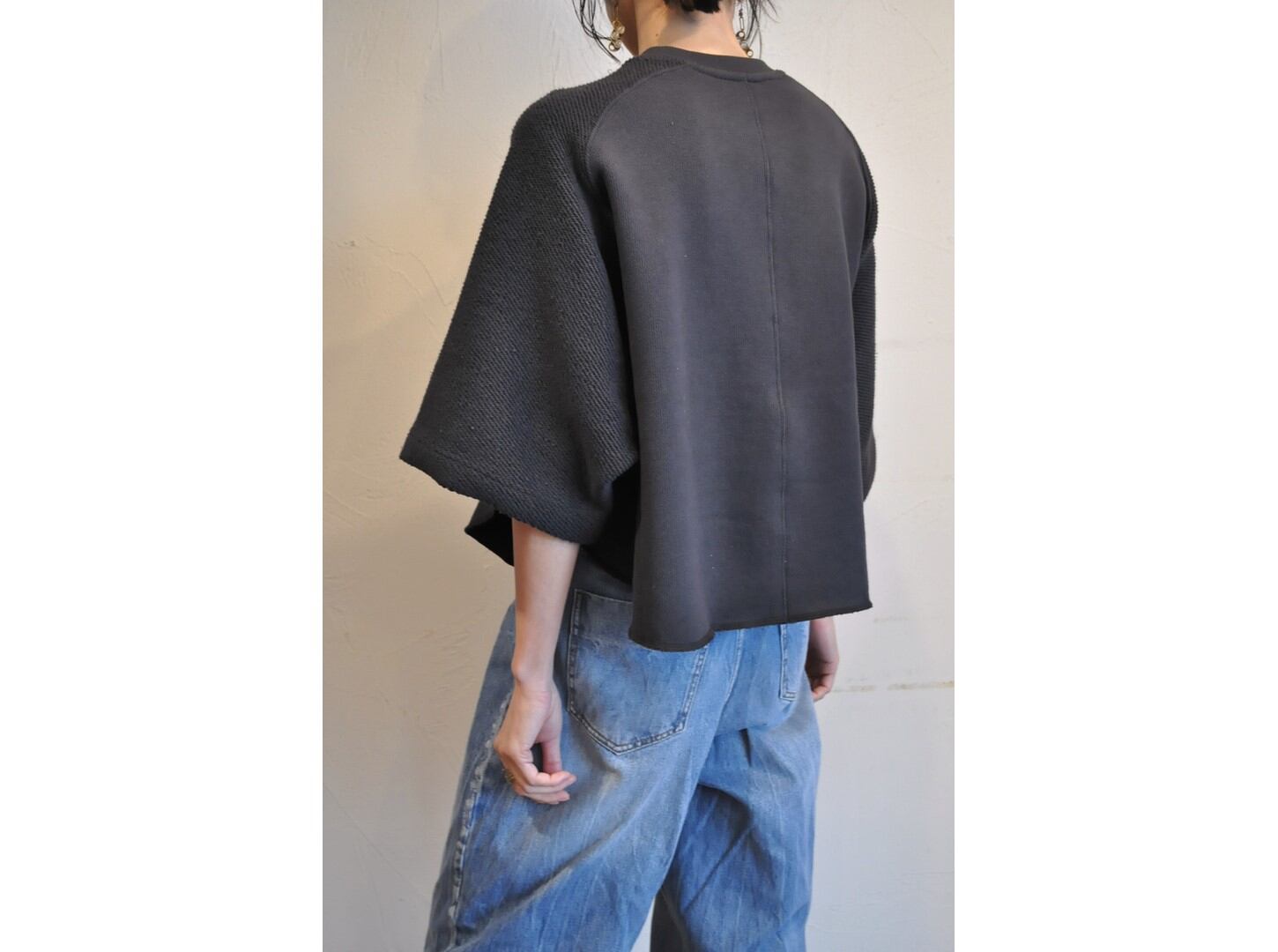 トリニティ裏毛を使用した、表面は太番手の糸でざっくりとしたラフな表情が特徴的で、見た目よりも軽く、触ると柔らかくふわっとソフトな触り心地。
