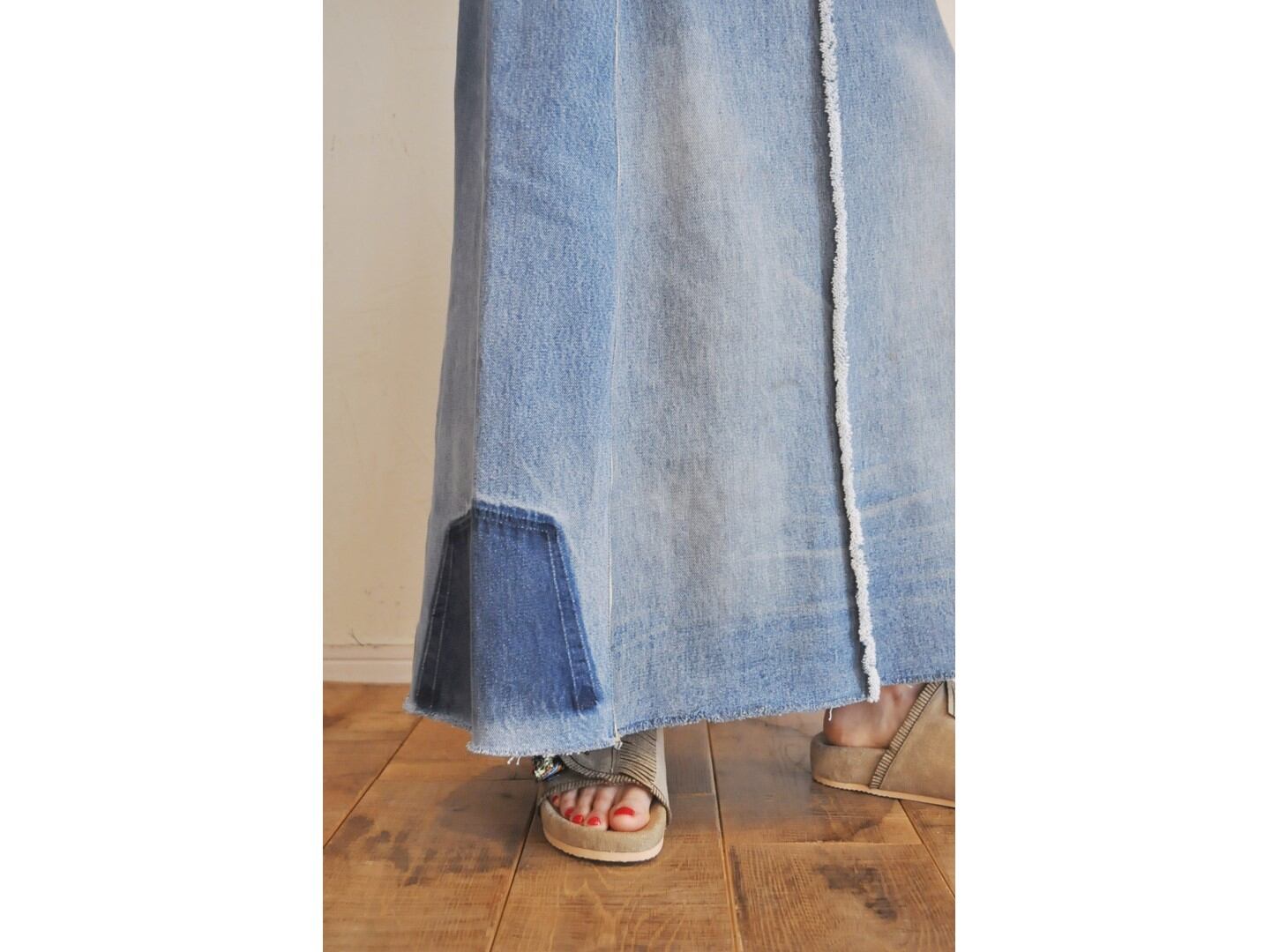 ●ロング丈のデニムスカートです。デニムの色落ち具合はサンプルと同じくらいのものでそろえておりますが、古着のデニムのリメイクになりますので、色味や生地感に個体差が出ます。